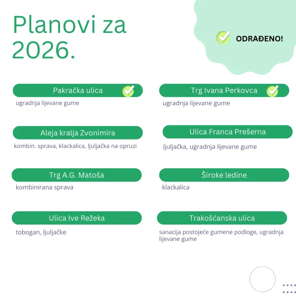 Posebnu pažnju posvetit ćemo zaštiti djece od prometa. Postavit ćemo zaštitne ograde, djelomično ili u cijelosti, oko pojedinih dječjih igrališta koja se nalaze uz prometnice ili frekventnije gradske zone – na Trgu Ivana Perkovca, Harambašićevoj ulici i Ulici Đure Kuhara. Cilj je stvoriti sigurnije okruženje za boravak i bezbrižnu igru djece.